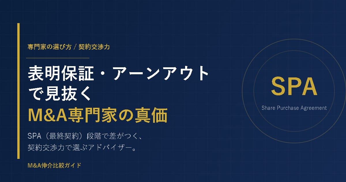 事業承継・M&Aの専門家選びは、マッチング力や成約スピードで語られがちですが、最終的なオーナーの手残りを決めるのはSPA段階の条項交渉です。表明保証の範囲、アーンアウトの設計、ロックアップの柔軟性、補償条項のパラメータ——これらを具体的な数字と文言で語れるアドバイザーを選ぶことが、「判を押した後の後悔」を防ぐ最大の防御線となります。初回面談の段階から契約交渉力を問う視点を持ち、連携する弁護士・税理士の顔ぶれまで含めて比較検討してください。